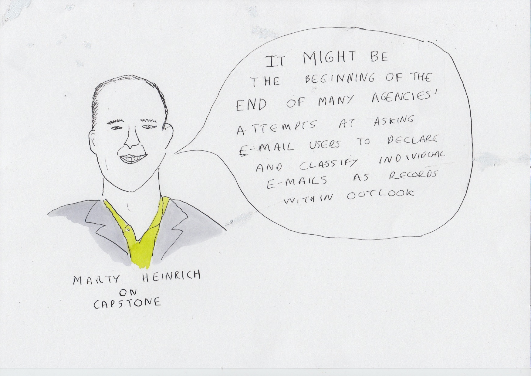• The FCW news piece states that NARA will say more about Capstone at this event NARA are running for the vendor community on the 10 September.   At the event NARA will issue ‘a grand challenge to industry’ regarding the type of technology needed with a view to ‘supporting Federal agencies as they implement the Managing Government Records Directive, particularly directive Goal A3.1.’ Goal A3.1 is the commitment ‘to work with private industry and other stakeholders to produce economically viable automated records management solutions’.    @adravan pointed out to me on Twitter that the event will be discussing not just Capstone but electronic recordkeeping challenges in general.