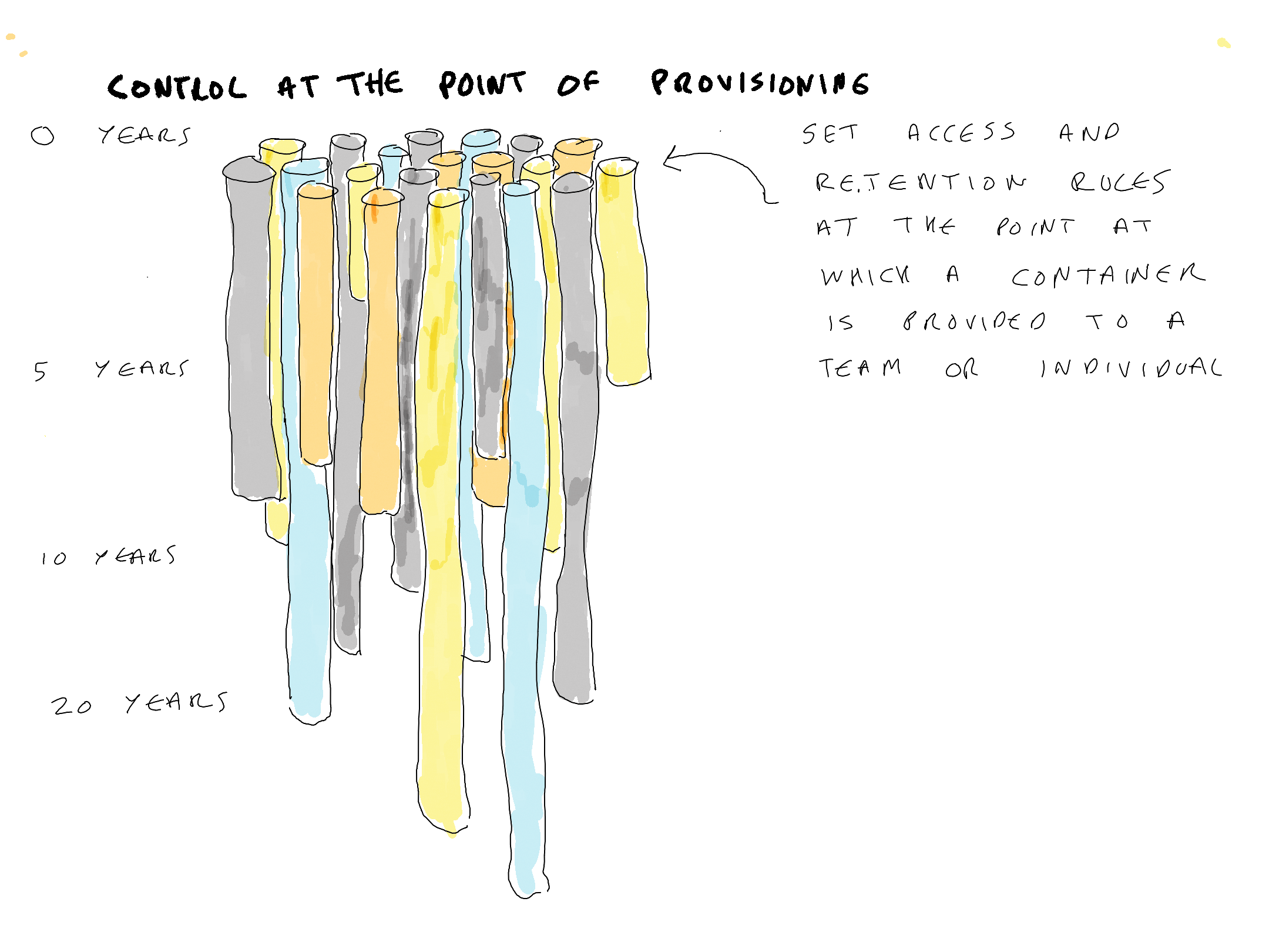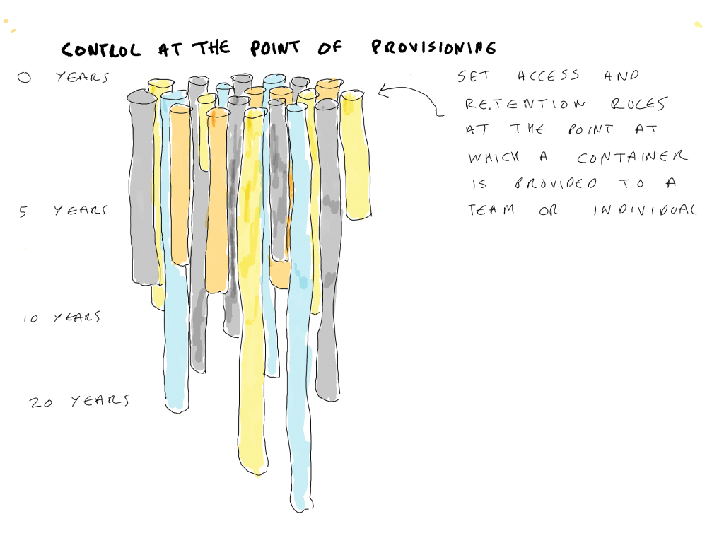 Control at the point of provisioning involves setting default retention rules and access permissions on containers at the point at which they are provisioned to individuals and teams. It has proved to be an effective way of preventing the build up of uncontrolled digital heaps.